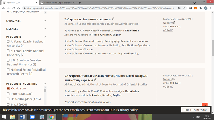 Only 8% of all world journals are indexed in the DOAJ database, there are only 8 Kazakhstani journals. In the economic sphere “The Journal of Economic Research & Business Administration” is the first and only journal in Kazakhstan included in the database.
