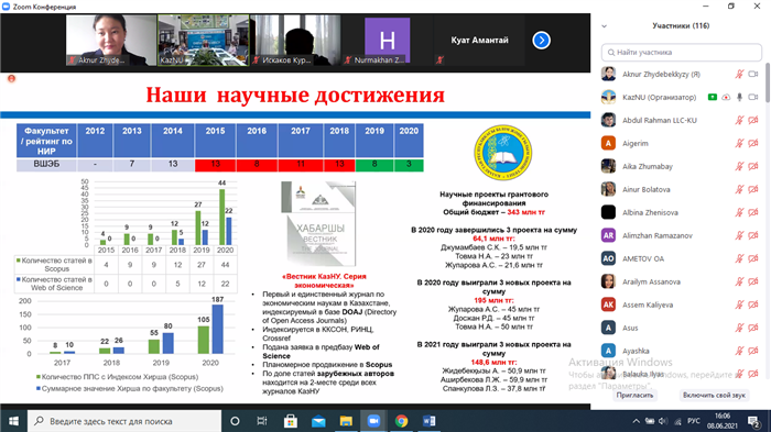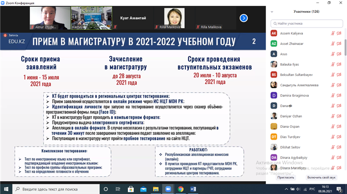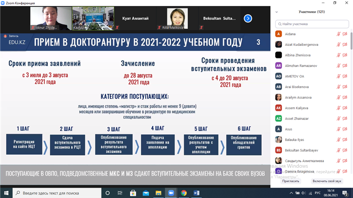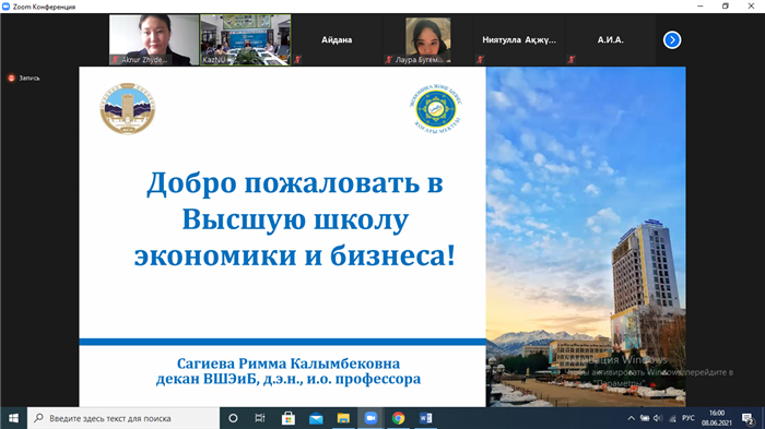 On June 8, 2021, the Dean of the Higher School of Economics and Business, Doctor of Economics, Acting Professor Rimma Sagiyeva Kalymbekovna held an online meeting with applicants. The meeting was attended by the senior staff of the faculty, heads of departments, who answered the questions of the applicants. They discussed the rules for applying for bachelor's, master's and doctoral programs, the specifics of educational programs at the faculty, student life, and much more.