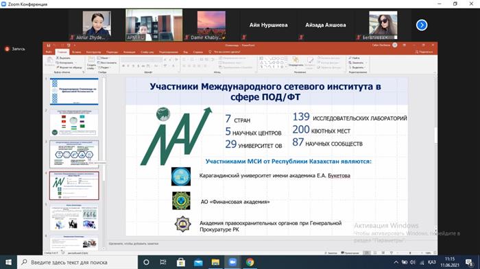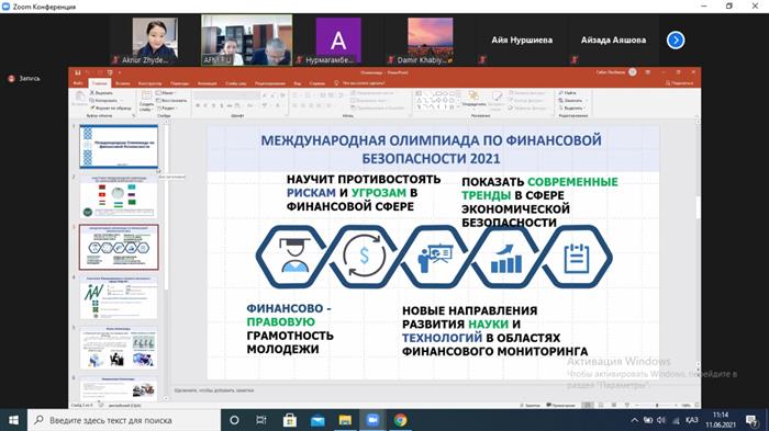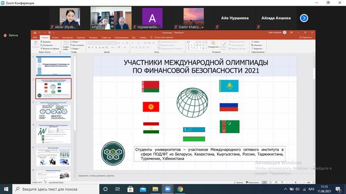 On June 11, 2021, an online meeting was held with representatives of the Agency of the Republic of Kazakhstan for Financial Monitoring, dedicated to the organization of the International Olympiad on financial security. The goals of the Olympiad are aimed at improving the information, financial, legal literacy and cultural level of young people. The meeting was attended by students and faculty of the Higher School of Economics and Business, the Faculty of International Relations, the Faculty of Information Technology and the Faculty of Law. The Olympiad is organized by JSC "Financial Academy" together with the International Network Institute in the field of AML/CFT and the first qualifying stage is held until June 15, 2021.