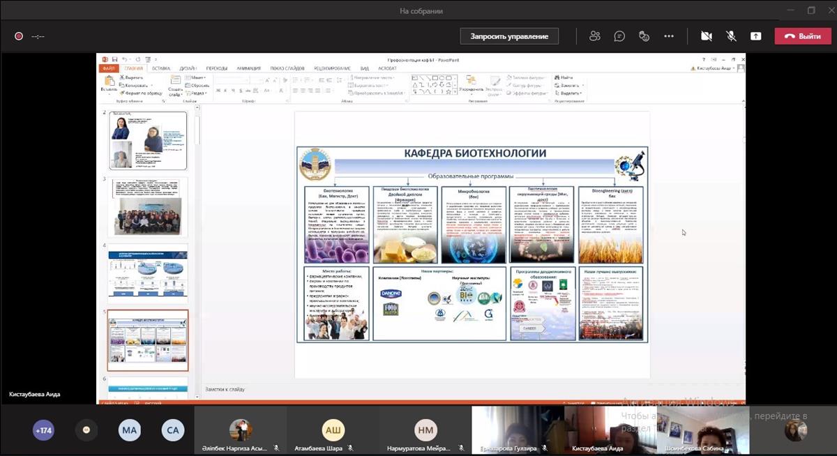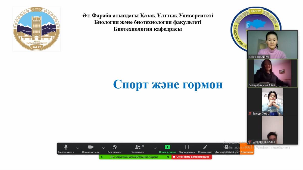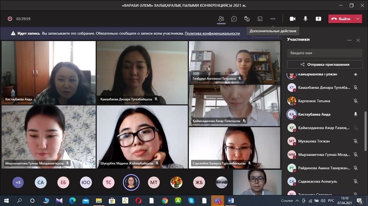 4/8/2021April 7 at the Faculty of Biology and Biotechnology KazNU named after Al-Farabi hosted the International Conference of Students and Young Scientists "Farabi Alemi". At the opening of the conference spoke the dean of the Faculty of Biology and Biotechnology Doctor of Biological Sciences, Professor, an academician of the National Academy of Sciences of the Republic of Kazakhstan Zayadan Bolatkhan Kazykhanovich. Then the reports were delivered in sections. Section on modern problems of biotechnology chairman: candidate of biological sciences, associate professor Kistaubaeva Aida Serikovna, and the moderators of the section were: doctor of biological sciences, professor Aytasheva Zaure Gainutdinovna, doctor of biological sciences, professor Karpenyuk Tatyana Anatolyevna. Biological Sciences, Associate Professor Zhumabayeva Beibitkul Akimalievna, Cand. Biol. Sciences, associate professor Zhunusbaeva Zhazira Kabulovna, doctor of biological sciences, professor Mukasheva Togzhan Dzhangeldinovna. In total, 14 students made presentations, of which the following students won prizes: I place, Angelina Gisbrecht (IV year); II place, Shukurbek Madina (IV course), Kamalbaeva Dinara (IV course); III place, Amina Raidinova (IV course), Sarsenbek Balausa (IV course); Myrzakhmetova Gulnaz (IV course).