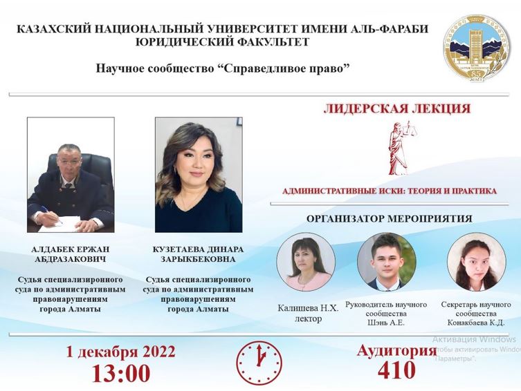 4/17/2023On April 17, 2023, a guest lecture was held by Doctor of Law, Professor of the Department of Theory and History of State and Law, Constitutional and Administrative Law of the Faculty of Law of Al-Farabi Kazakh National University, specialist in constitutional and administrative law Kalisheva Nazhiya Khussainovna on the topic "Constitutional reform: transformation of public administration in the Republic of Kazakhstan at the present stage". Thus, during the meeting, issues related to constitutional reforms in Kazakhstan, which influenced the course of administrative reform, the transformation of public administration and the expansion of the sphere of administrative justice, were considered.