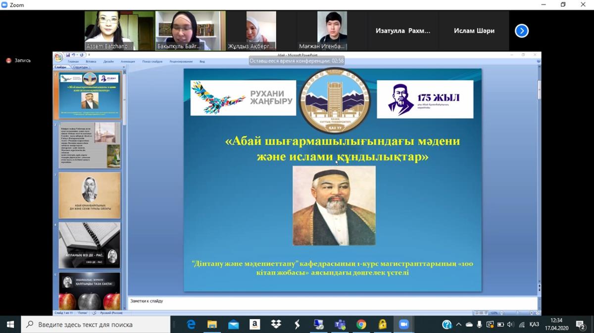 4/24/2020On April 24, 2020, the Department of Religious and Cultural Studies, Al-Farabi Kazakh Naiotnal University jointly with the National University of Uzbekistan held an international scientific and practical conference “Problems of Creating Modern Technologies to Combat Information Threats in the Globalization Context”.