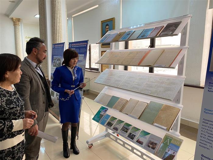 During the event, expositions of the Al-Farabi's Scientific Library’s exposition of “al-Farabi”, an exhibition of Abai's life collected in the funds of the State Historical, Cultural, Literary and Memorial Museum-reserve of Abai “Zhidebay-Borili”, memoirs of Arkham Kakitaevich, Niyazbek Aldazharov, Akhat Shakarimuly, which formed the basis of research by scientists who studied his work, were also presented the manuscripts of Shakarim Kudaiberdiev «Kazakh ainasy”, «Enlik Kebek”, translated by Akhat Shakarimov, including «Abai Alemi», an exhibition of books and manuscripts, where printed editions of the Abai Museum were presented.