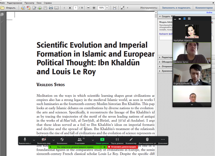 During a series of webinars, students were provided with lecture materials in advance, and during the webinar, the professor answered all the questions asked. The views and new research proposed by Professor Syros Vasileios have generated the interest of doctoral and master students. Lectures on "soft power" and "hard power", political and philosophical views of Ibn Khaldun, the Ottoman Empire, Central and East Asia were discussed. Syros Vasileios, fluent in several languages, shared new historical and political views based on historical facts. The webinar network was held remotely (online) on the Zoom platform.