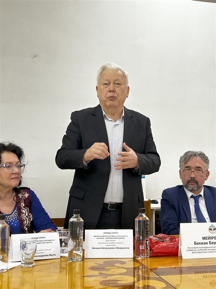 At the end of the meeting, the Head of the Department, D.Sc. (Pedagogy), Professor Mynbaeva Aigerim Kazyevna, on behalf of all those present, all Kazakhstanis and herself personally, thanked the veterans of the International Anti-Nuclear Movement “Nevada-Semipalatinsk” for the closure of the Semipalatinsk test site and other large test sites in the world, for a nuclear-free and peaceful life in Kazakhstan.