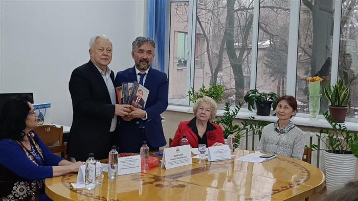 The meeting took place in the reading room of the Scientific Library of al-Farabi KazNU, at the Faculty of Philosophy and Political Science. Dean B.B. Meirbaev presented V.A. A memorable gift for Zhandauletov.