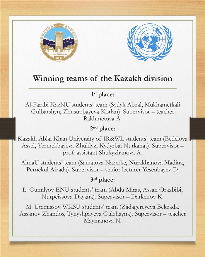 The chair of international relations and world economy of Al-Farabi Kazakh National University on March 27th, 2020 organized of remotely Republican Student subject Olympiad on “Regional Studies” specialty. The theme of the Olympiad is "Sustainable Development: New Challenges".