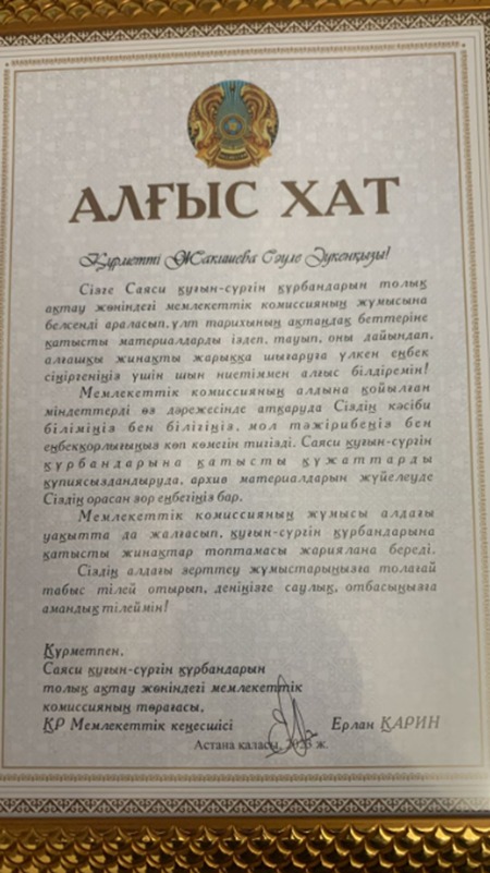 Letter of thanks from the State Adviser of the Republic of Kazakhstan, Chairman of the State Commission for the Full Rehabilitation of Victims of Political Repression E.T. Karin 3/28/2023 Read more >>