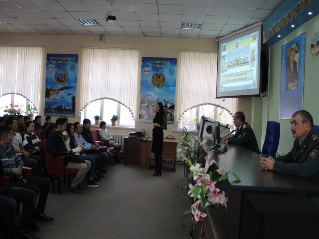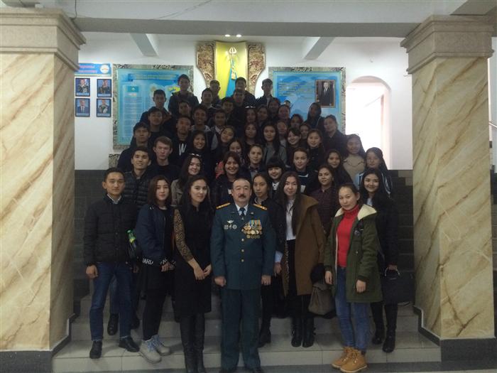 During the excursion the students get acquainted with the educational-material base of the department, visited the personal audiences of Kazakhstan's folk heroes B. Momyshuly and S. Nurmagambetov, the room of military-patriotic work, practically completed the exercises of shooting from small arms in an interactive laser shooting range. They examined the audience where they were presented with specialized workplaces, meteorological instruments used in the meteorological divisions of the Armed Forces of the Republic of Kazakhstan.