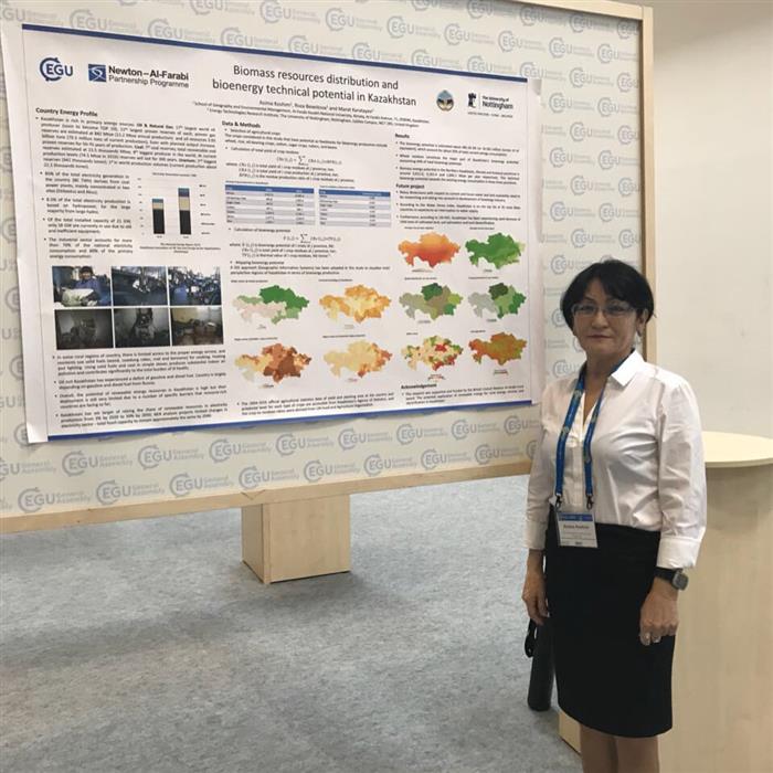 From 8 to 13 April 2018, the annual international geographical conference "European Geosciences Union (EGU) General Assembly" was held in Vienna (Austria) under the patronage of the Austrian Federal Ministry of Science and Research. This is the world's largest conference on geosciences and environmental sciences. The conference is supported by international scientific top-magazines, included in international citation indexes (SCOPUS, Web of Scince, Elsevier). This year, 13902 scientists took part in the conference: geologists, geophysicists, geochemists, geomorphologists, climatologists, geographers, surveyors and cartographers, and others from 107 countries. Results of 15,000 studies were presented. At the conference, in the section of geoinformation research and renewable energy sources, the presentation of the report "Biomass resources distribution and bioenergy technical potential in Kazakhstan: a GIS-based analysis" was also held. The report was prepared within the framework of the joint project of the Department of Cartography and Geoinformatics of Al-Farabi KazNU (Dr. AG Koshim and Dr. RT Bekseytov) and Nottingham University of Great Britain (Dr. Karataev M.). The aim of the project is quantitative assessment the possibility of using the potential of biomass and the spatial distribution of bioenergy potential across Kazakhstan. The results of the project show that the total potential of biomass of agricultural origin in Kazakhstan is more than 16.5 million tons of oil equivalent. The amount of energy that can theoretically be obtained from agricultural waste is 485 * 106 J, which is commensurate with 25-30% of the total energy consumption in the country and the reduction of greenhouse gases by 64.72 million tons. Based on the calculated data, four types of the territory of Kazakhstan's bioenergy potential are identified: it is a territory with a relatively high bioenergy potential, medium, low and insignificant. A series of GIS maps of potential opportunities for the production of alternative electricity shows that the main biomass resources and bioenergy potential are concentrated in Akmola, Kustanai and North Kazakhstan regions. A detailed presentation of the project can be found on the link (сcылкa).