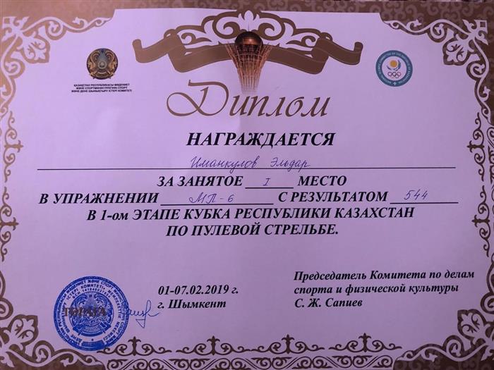 From February 01 to February 7, 2019 in Shymkent, the Cup of the Republic of Kazakhstan in pelt shooting was eaten. Imankulov Eldar, the 1st year student in the specialty “FKiS”, took the 1st place in the MP-6 exercise with the result of 544 in the 1st Stage of the Republic of Kazakhstan Cup in shot shooting. Congratulations!