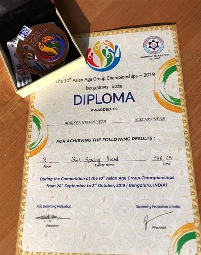 From October 24 to October 2, 2019, the Asian Championship among aquatic species age groups was held in Bangalore (India). The 2nd year student of the Department of Physical Education and Sports Borova Elizaveta won a bronze medal in ski jumping 3 meters.
