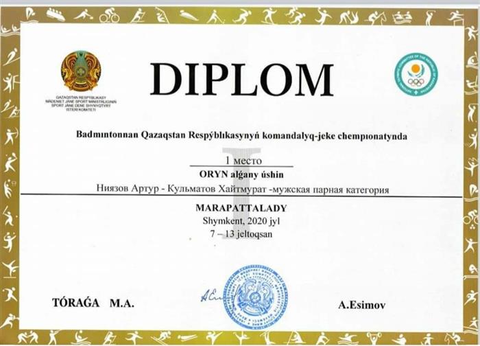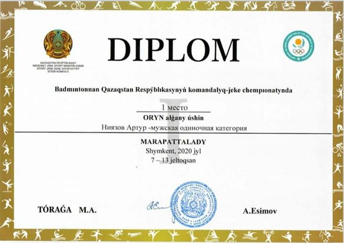 From December 7 to 13, 2020, the team-personal Badminton Championship of the Republic of Kazakhstan ended in Shymkent. The best athletes from the city of Almaty, the city of Shymkent, Turkestan, Karaganda, Akmola, Kostanay and West Kazakhstan regions of the Republic of Kazakhstan took part in this sporting event. According to the results of the Championship, 2nd year doctoral student in the specialty "Physical culture and sports", master of sports of international class of the Republic of Kazakhstan in badminton, Artur Niyazov became the champion in both the men's singles category and the men's doubles category, as well as a bronze medalist in the mixed doubles category.