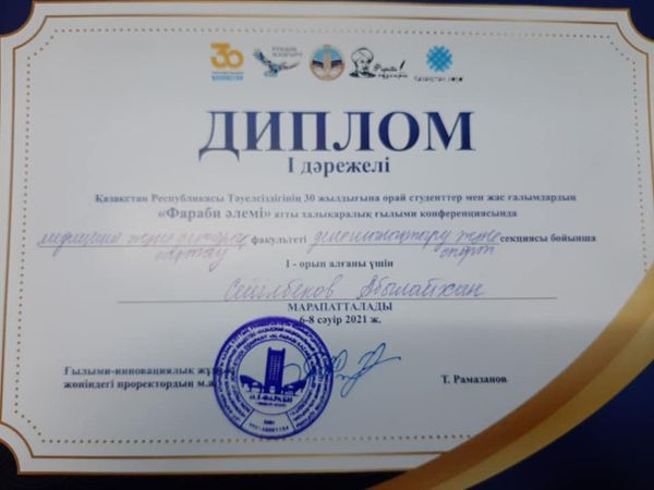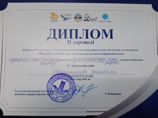 6. Erkynuly R. - Karagandy medicine university 1 year student. Bayandama takyryby: "Salauatty өmir saltyn kalyptastyrudaғy psychologiiология edister: visualization of the affirmation." Gylymi zhetekshis: Sabieva A.B. «Фараби Әлемі» студенттер мен жас ғалымдардың халықаралық конференциясы туралы есеп. 2021.