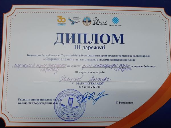 On April 8, 2021, on the basis of the Department of Physical Education and Sports of the Faculty of Medicine and Healthcare of Al-Farabi KazNU, an international scientific conference of students and young scientists "Farabi Alemi" was held in a distance mode on the Zoom platform, dedicated to the 30th anniversary of problems of theoretical and practical aspects of healthy lifestyle, physical culture, sports and sports medicine.
