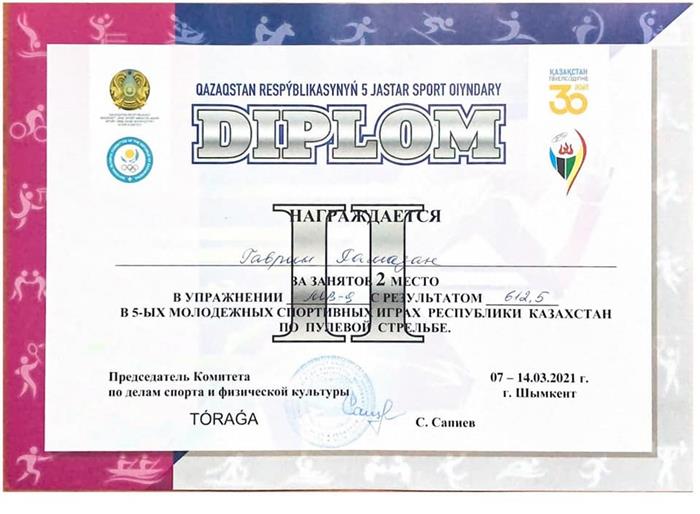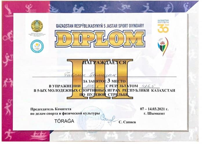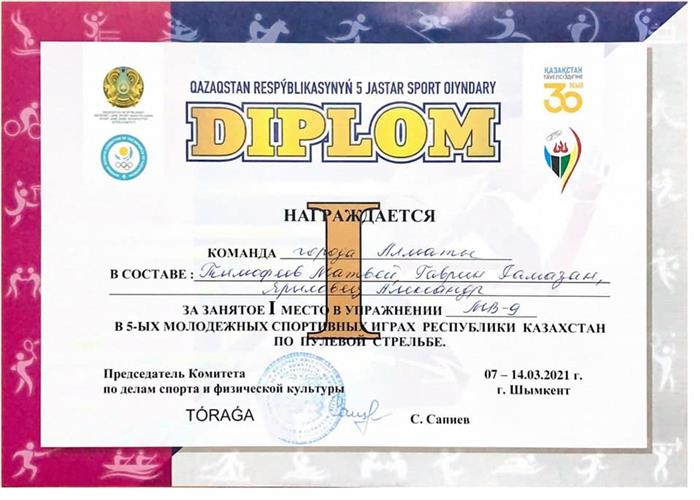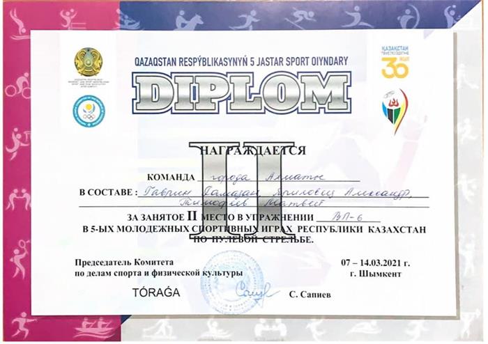 From 7 to 14 March 2021, in honor of the celebration of the 30th anniversary of the Independence of the Republic of Kazakhstan, the 5th Youth Sports Games of the Republic of Kazakhstan in bullet shooting were held in the city of Shymkent. At these competitions, a 2nd year student of the Department of Physical Education and Sports of the Faculty of Medicine and Healthcare Gavrin Ramazan became the winner and prize-winner both in the team and in the individual standings in performing various bullet shooting exercises
