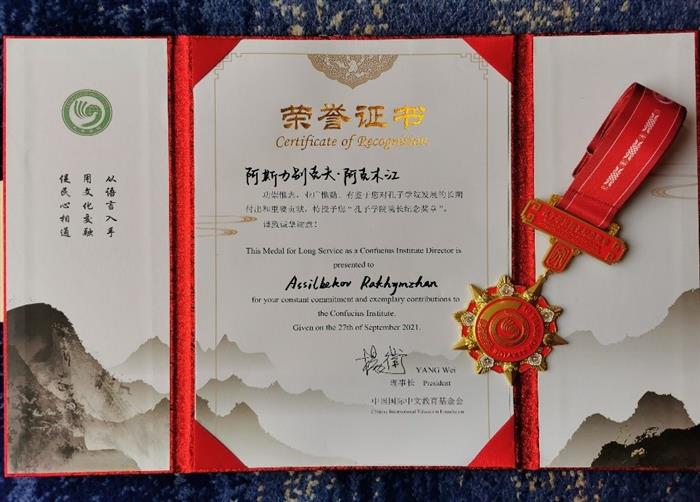 l In 2021, Rakhimzhan Ozenbekovich Asylbekov, the director of our institute, won the "Best Director" medal at the "World Confucius Institute" joint forum.