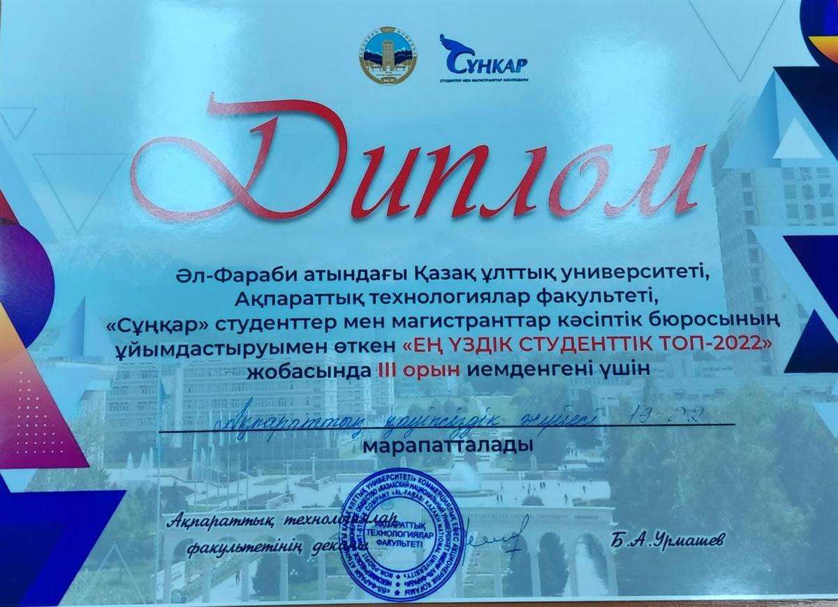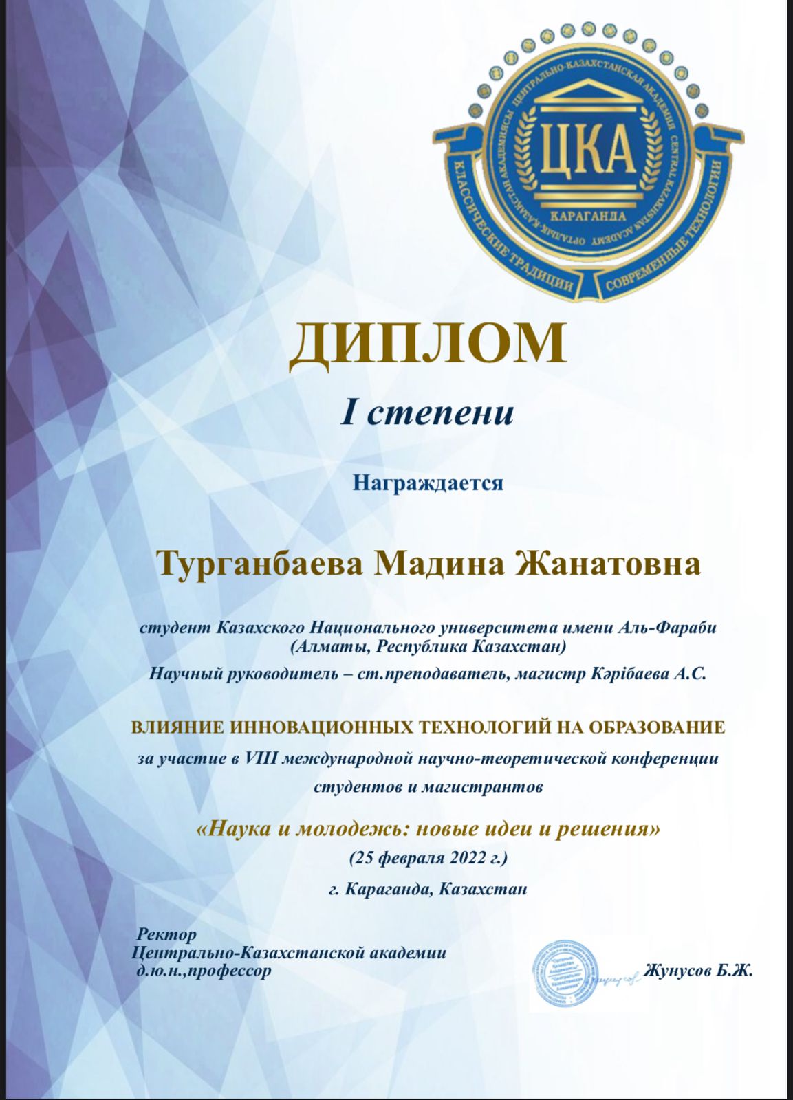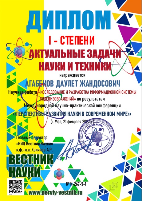 2nd year master student of the specialty IS Agabekov Daulet won first place at the International conference "Prospects for the development of science in the modern world." Ufa, RF, 21.02.2022. Scientific work: "Research and development of video image information system"