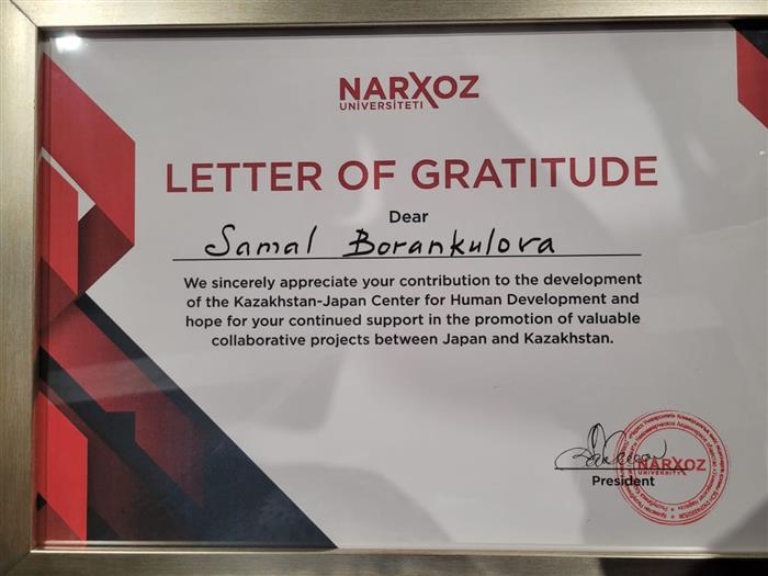Recently, the leading lecturer of the Japanese Department of the Department of the Far East, Samal Borankulova, took part in the ceremony dedicated to the 20th anniversary of the founding of the Kazakh-Japanese Center for Human Resource Development (KJC), which opened in 2002 on the basis of Narkhoz University as a unique project of the Japanese government agency JICA, and received a letter of thanks.