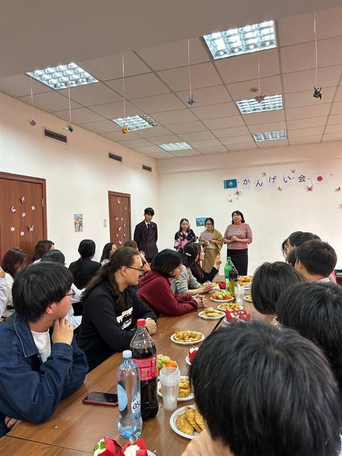 Japanese students did not fall behind either. Risa Ikezoe from Tsukuba University sang the Kazakh song "Altynai" (Moldir Auelbekova), and Takumu Sanno, a student at Tokyo University of International Studies, performed "Körugly" with a dombra. First-year students amazed their sempai by singing and speaking in Japanese. The words of the fourth-year students who visited Japan and the third-year student, head of the Student Dean's office Azhar, gave their kohai inspiration. Many prizes were given out for the contests, and a variety of meals had been set on the table. Everyone who attended the party left with various feelings, yet they all surely experienced warmth.