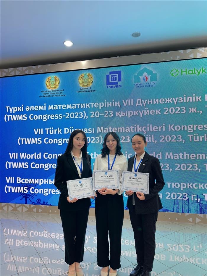 First-year master's students from the Department of Mechanics, Faculty of Mechanics and Mathematics at Al-Farabi Kazakh National University, Alina Abdidin, Kuralai Eldoskyzy, Nazerke Momysheva, and Beket Bodau, presented their papers at the VII World Congress of Mathematicians of the Turkic World (TWMS Congress-2023), which took place in the city of Turkistan from September 20 to September 23, 2023, with the support of the Ministry of Science and Higher Education of the Republic of Kazakhstan, the administration of Turkistan Region, and the International Kazakh-Turkish University named after H.A. Yasawi (IKTU).