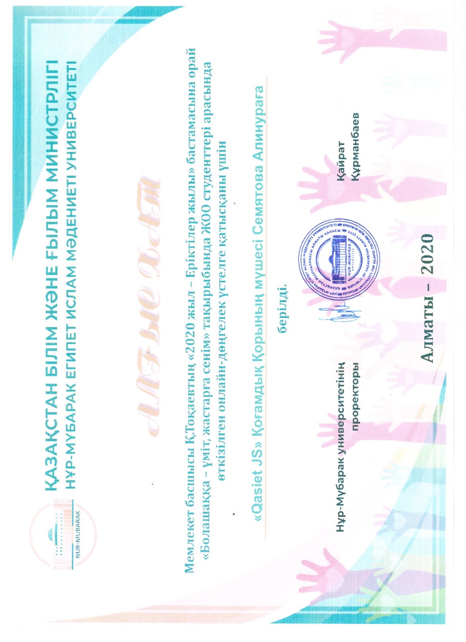 The professor of the Department of Artificial Intelligence and Big Data Kunelbaev Murat took part in the conference dedicated to the 3rd International Day of Elsevier and was awarded a certificate. 2/3/2021 Read more >>