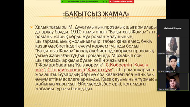 The students shared their thoughts on the work of our grandfather Mirzhakyp Dulatov. After reviewing his work, the students spoke about their feelings.