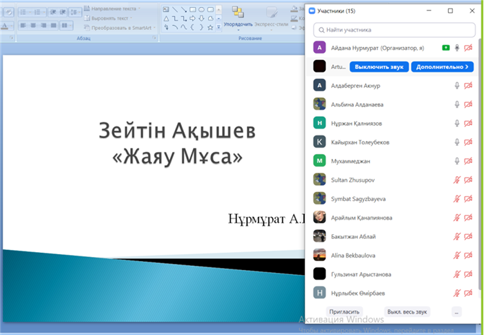 Students discussed in detail the work of Z. Akishev "Zhayau Musa". The main idea of the work was voiced and which character is closest to the heart. Proverbs and sayings corresponding to the content of this work were also discussed. The opinions of students were listened to. I fully stated my thoughts on this topic.
