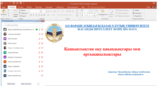 During the meeting, Ainur Alibekovna made a presentation on one of the most pressing issues of today: "Difficulties and advantages of distance learning." Students asked a variety of questions and talked about interesting events and difficulties in distance learning in the current quarantine. We hope that the meeting was very interesting and the students received answers to their questions.