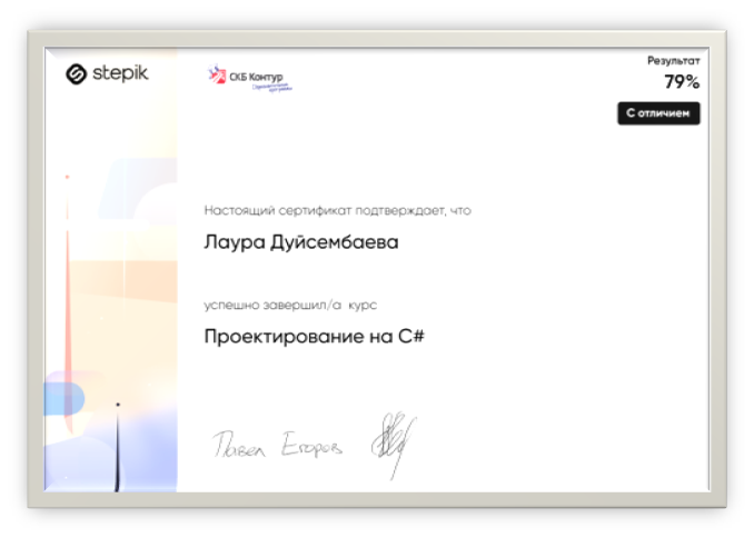 Senior Lecturer of the Department of artificial intelligence and Big Data Duisembayeva Laura Serikovna Stepik.org received certificates "Programming in the language of C#" from Omsk Technical University on the platform.