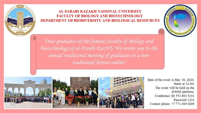 Chair of biodiversity and bioresources invites you to participate in the Forum of alumni KazNU dedicated to the 1150th anniversary of al-Farabi on May 30, 2020 at 12.00.