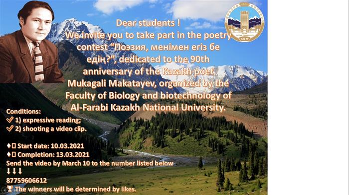 We invite you to take part in the poetry contest “Поэзия, менімен егіз бе едің?”, dedicated to the 90th anniversary of the Kazakh poet Mukagali Makatayev, organized by the Faculty of Biology and biotechnology of Al-Farabi Kazakh National University.
