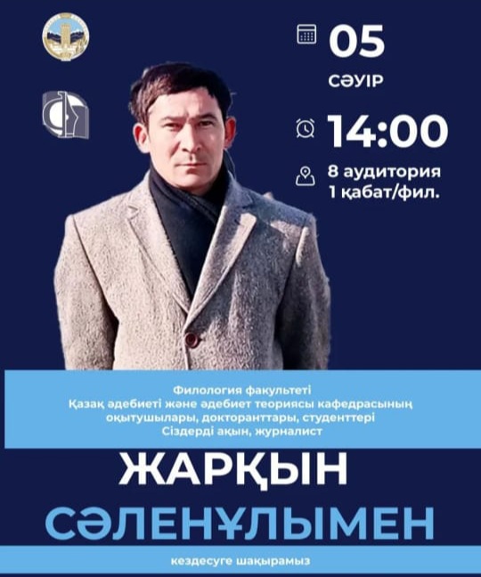 On April 5, 2022, the Department of Kazakh Literature and Theory of Literature of the Faculty of Philology held a meeting with the famous poet, journalist Zharkyn Salenuly. The organizer of the meeting is the candidate of philological sciences, associate professor Mambetov Zh.O. The meeting was attended by students, undergraduates and doctoral students of the Faculty of Philology and the Faculty of Journalism. During the meeting Zharkyn Salenuly read his poems and answered questions.