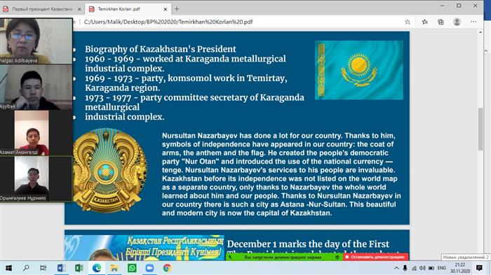 Every year on December 1, citizens of Kazakhstan celebrate the Day of the First President. On November 30, 2020 in honor of the national holiday Associate Professor of Foreign Languages Department of Al-Farabi Kazakh National University, U.B. Adilbayeva had organized and conducted an educational event within the framework of the project “Brighten your corner where you are”.
