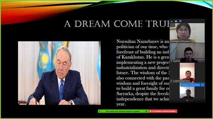 First year students of the Faculty of Information Technologies attended the event and made online presentations dedicated to the Day of the First President in English language. The purpose of this event was to give students the opportunity to make reports in English about the first president. Students presented materials about life, work path, contributions of N.A. Nazarbayev to the development of Kazakhstan, showed the versatile personality of Elbasy.