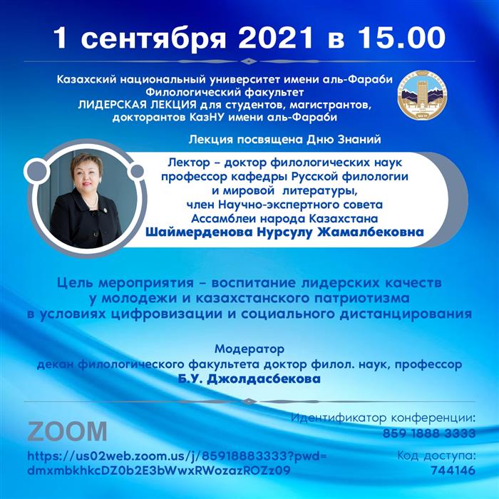 Today at 15.00 on ZOOM platform, Shaimerdenova Nursulu Zhamalbekovna, Professor of the Department of Russian Philology and World Literature, member of the Scientific Expert Council of the Assembly of the People of Kazakhstan will deliver a lecture dedicated to the Day of Knowledge.
