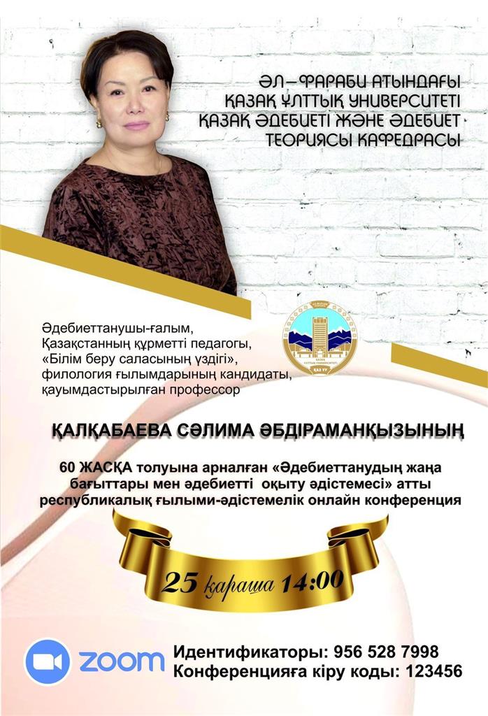 The Department of Kazakh Literature and Theory of Literature invites you to take part in the online confrence on the topic: "New trends of literary studies and literature teaching methodology". The conference is devoted to Kalkabayeva Salima Abdramanovna's 60th anniversary, candidate of philological sciences, associate professor and "Honoured Worker of Education" .