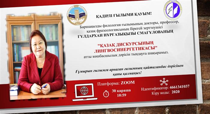 On November 30, at 10.59 on the ZOOM platform, Doctor of Philology, Professor, Smagulova G.N. will deliver a lecture on the topic: Linguosynergetics of the Kazakh discourse.