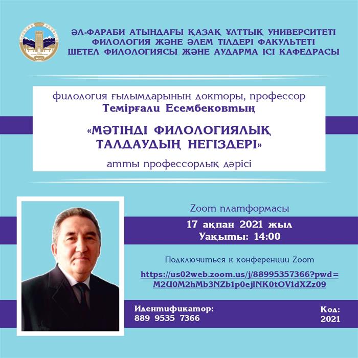 You are invited to the lecture delivered by professor, doctor of philology, Temirgaly Esembekov. The topic of the lecture is: “Bases of philological text analysis” . The lecture is organized by the Department of Foreign Philology and Translation Studies. The lecture will take place on February 17, 2021, at 14 .00 p.m.
