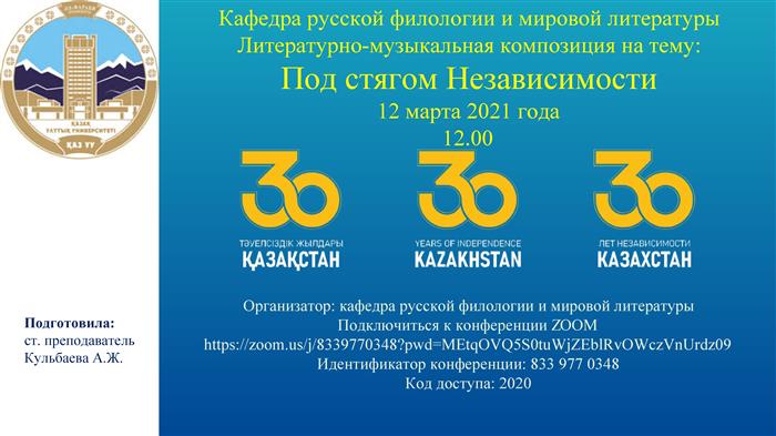 On March 12, 2021 at 12.00 a literary and musical composition by the senior teacher of the Department of Russian Philology and World Literature, Almira Zhusupbekovna Kulbaeva will take place on the topic "Under the banner of Independence".
