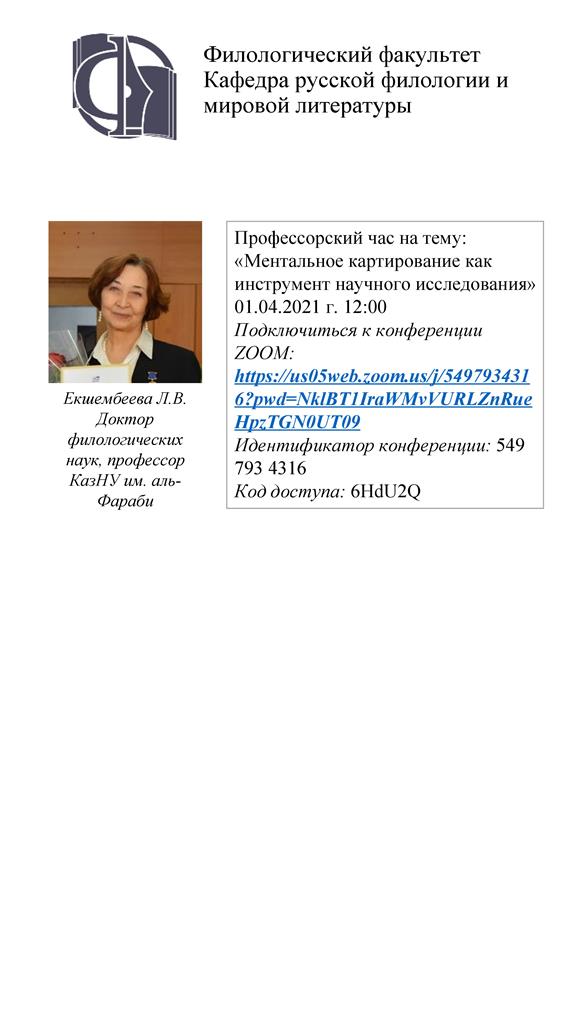 The Department of Russian Philology and World Literature invites you to the professor’s hour of the doctor of philological sciences, professor, Ekshembeeva L.V.
