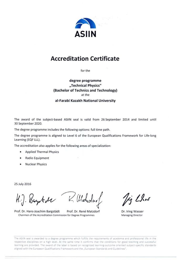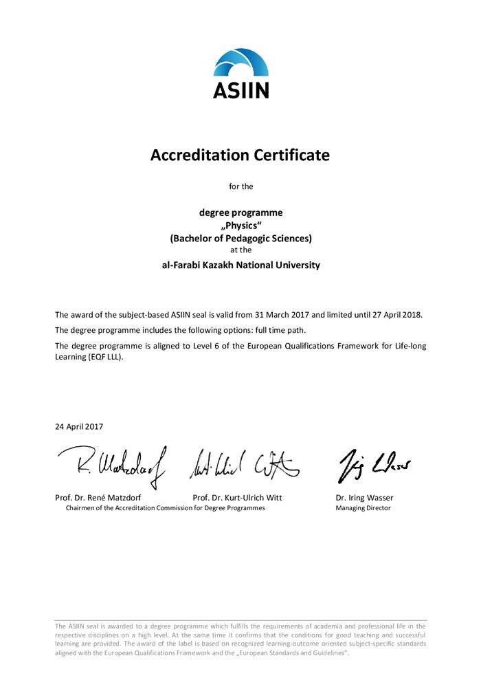 ASIIN International Certificate in the specialty "5V061100 Physics"