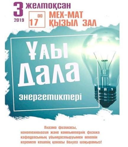 Teachers and students of the department "Plasma Physics, Nanotechnology and Computer Physics" invite you to the annual event "Ұлы дала энергетиктері"! |