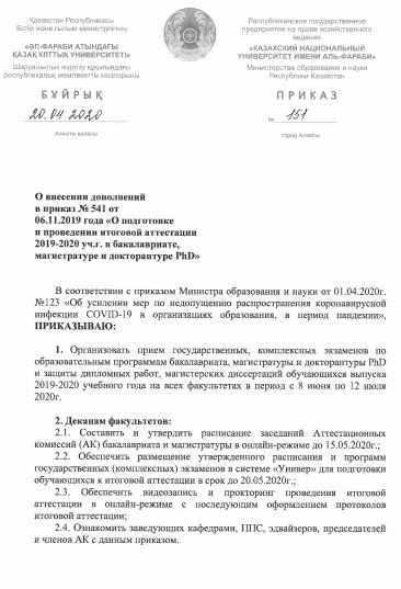 Dear teachers and students! The academic year 2020-2021 starts on September 14, 2020. All undergraduate and graduate studies will be held in the format of distance learning in on-line mode. Theoretical training for PhD doctoral students will take place off-line, taking into account the sanitary and epidemiological regime (SES). |
