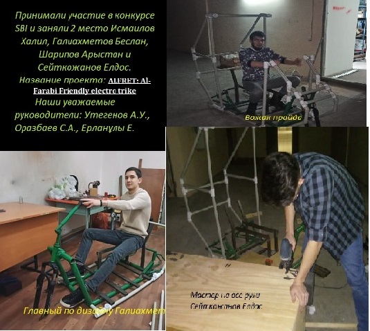 Ismailov Khalil, Galiakhmetov Beslan, Sharipov Arystan and Seitkozhanov Eldos the 3rd year students participated in the SBI competition and were awarded an honorable 2nd place. Project Name is “ALFRET: Al-Farabi frendly electro trike”. Supervisors: Utegenov A.U., Orazbayev S.A., Yerlanuly E.