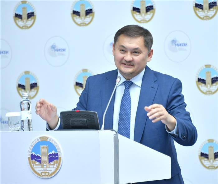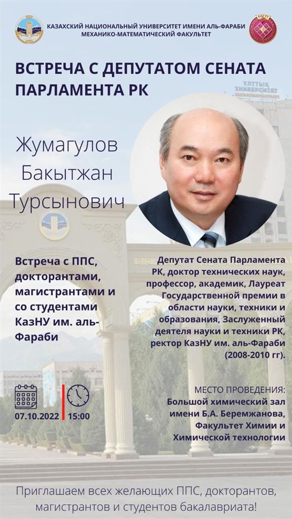 Deputy of the Senate of the Parliament of the Republic of Kazakhstan, Academician Bakytzhan Zhumagulov met with the teaching staff, doctoral students and undergraduates at the Al-Farabi Kazakh National University. The Guest of honor was introduced by the Chairman of the Board – Rector of Al-Farabi Kazakh National University Zhanseit Tuimebayev, focusing on the main stages of his life and professional path. Bakytzhan Zhumagulov is an alumnus of KazNU, who graduated from the Faculty of Mechanics and Applied Mathematics in 1979. He began his career with scientific and teaching activities, starting from the position of assistant, professor, Head of the department to the rector. Today he is a Doctor of Technical Sciences and academician of the following institutions: National Academy of Sciences of the Republic of Kazakhstan, the International Engineering Academy, National Engineering Academy of the Republic of Kazakhstan.