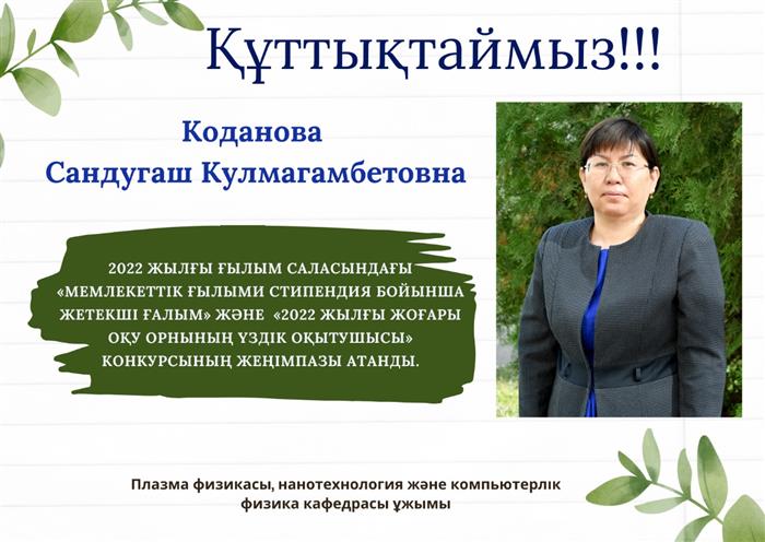 The head of the Department of Plasma Physics, Nanotechnology and Computer Physics, Ph.D., Professor Kodanova Sandugash Kulmagambetovna congratulates the staff and honorary colleagues of the department on one great achievement in the scientific field and wishes creative success in work, joy and joy to the family. |