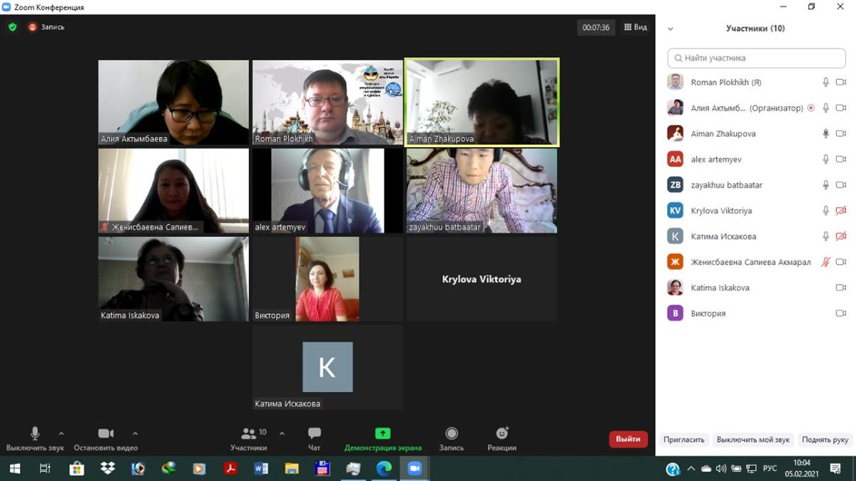 2/20/2021On February 20, at 11:00, a meeting was held on the topic: "New Educational Programs and methodological conference". All the coordinators of the existing educational programs of the Faculty of Geography and Nature Management were invited. From the Department of Recreational Geography and Tourism participated: Aktymbaeva A. S., Moldagalieva A. E., Abisheva Z. M., Plokhikh R. V., Aktymbaeva B. I., Ableeva A. G., Zhakupova A. A. Topical issues on the methodological conference to be organized at the al-Farabi Kazakh National University were discussed at the conference.