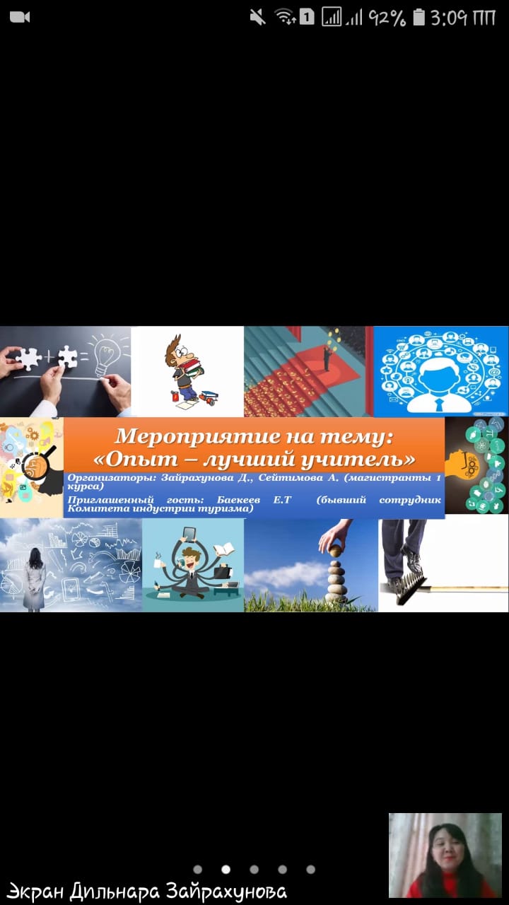 2/23/2021On February 23, at 14.00, Undergraduates of the 1st year Zayrakhunova Dilnara and Seytimova Asem held an event on the topic "Everything is learned with experience". At the event, the speakers told about the experience of famous people, ups and downs. The guests had the opportunity to ask questions from the former employee of the Committee of the tourism Industry Baekeyev Yernur Tolybaevich. He shared his invaluable experience, and also told us what mistakes should not be made in interviews.