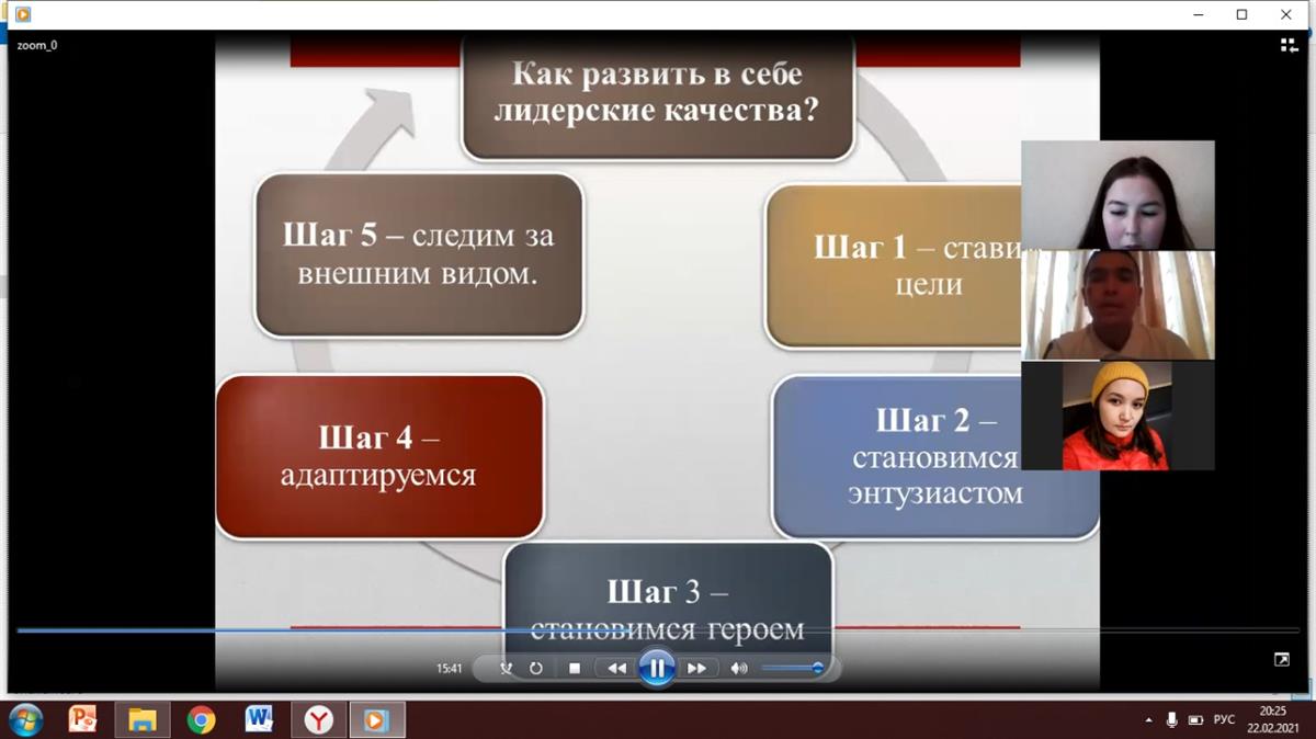 2/20/2021On February 20, at 12.00, undergraduates of the 1st year of the Department of "Recreational Geography and Tourism" held an event on the topic: "How to become a leader?". Thepurpose of the event : to create psychological and pedagogical conditions for improving the effectiveness of the educational system by further developing the leadership qualities of students and involving them in personally and socially significant activities.At the event, the speakers talked about leadership and how to become it , as well as a test to identify leadership qualities and a training consisting of 5 steps to wake up a leader.